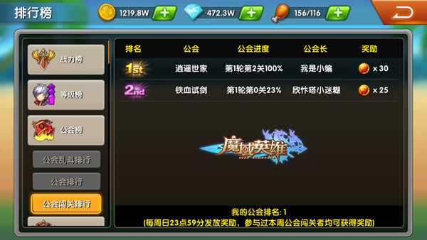 公会闯关设置闯关记录和排行榜。闯关记录可以查看公会成员当前的闯关当日和一周的闯关记录。公会闯关排行榜记录本服所有公会的公会闯关进度,按照闯关的公会进度进行排行,每周日结算可以获得大量的神器进阶丹奖励,只要参与过本周公会闯关的玩家都能获得奖励。